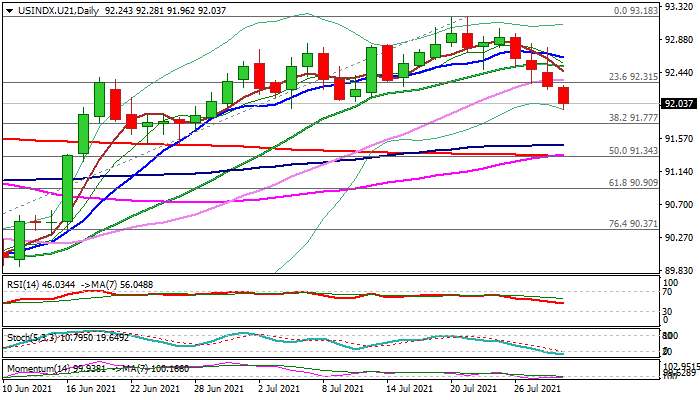 Pullback from new three-month high at 93.18 (July 21 peak) accelerated and cracked initial support at 92.00 zone, which guards more significant levels at 91.77 (Fibo 38.32% of 89.50/91.18).