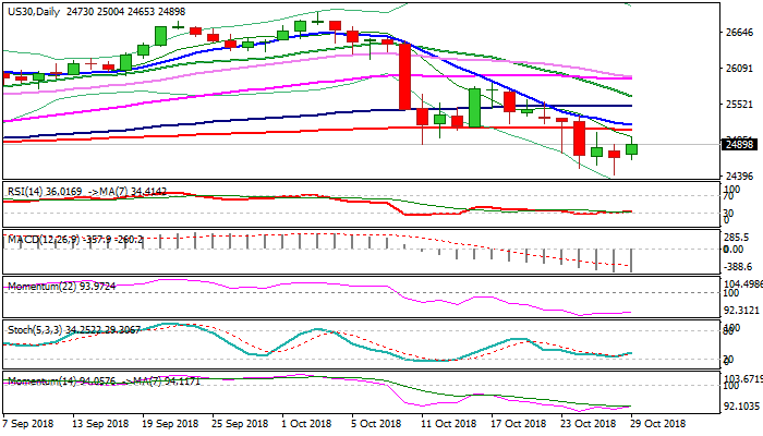 Recovery cracked pivotal barrier at 24961 (Fibo 38.2% of 25844/24415) but was so far unable to break higher, keep intact strong resistances at 25121/25202 (converging 200/10SMA’s), violation of which would generate stronger bullish signal.