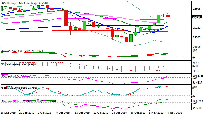 Strong rally in past two weeks requires correction, but overall structure remains bullish and extended pullback should find support at 25430 zone (rising 10SMA / Fibo 38.2% of 24085/26267 rally) to keep bulls in play.