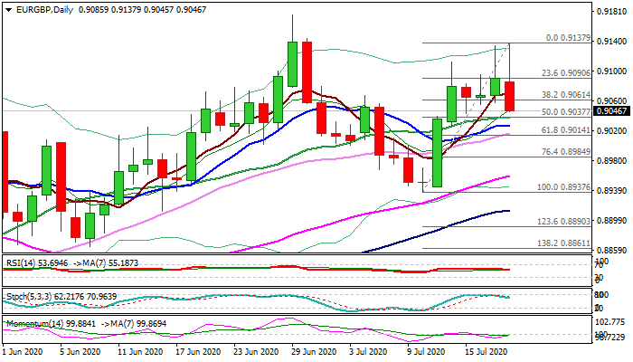 Fresh weakness probes below pivotal Fibo support at 0.9061 (38.2% of 0.8937/0.9137 upleg), with today’s close below this level to add to negative signals.
