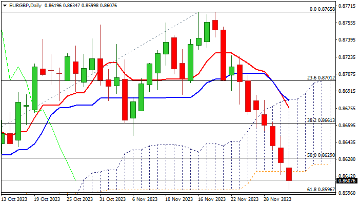 EURGBP continues to trend south and hit new 3 ½ month low on Friday, in extension of steep and uninterrupted downtrend from 0.8765 (Nov 16 peak).