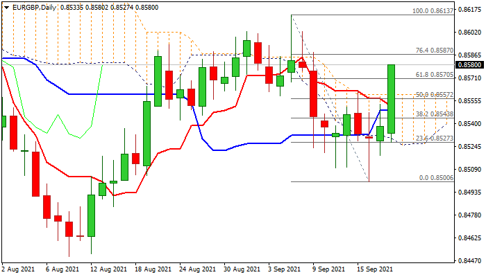 Fresh bullish acceleration has so far retraced over 61.8% of 0.8613/0.8500 bear-leg) and pressuring next Fibo barrier at 0.8587 (76.4%) violation of which would open way towards key resistance at 0.8613 Sep 7 high).