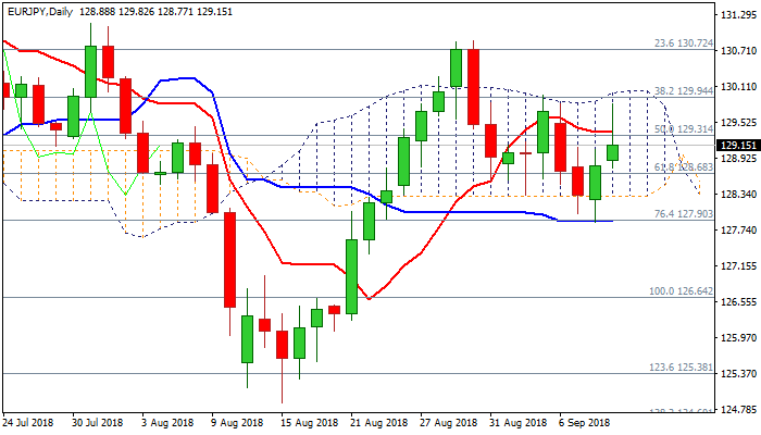 Close above cracked daily Tenkan-sen (129.36) is seen as minimum requirement to keep in play bullish bias for renewed attempt at cloud top.