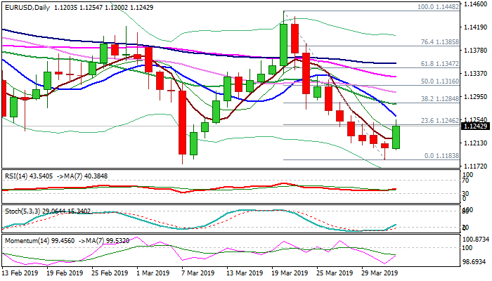 The Euro bounces from multi-week low at 1.1183 after strong bears stalled just ahead of key supports at 1.1186/76, boosted by strong EU data (Services PMI Mar 53.3 vs 52.7 f/c; Retail Sales Feb 2.8% y/y vs 2.3% f/c; 2.2% prev).
