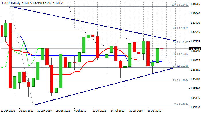 Initial probe through triangle resistance at 1.1740 (session high was at 1.1745) proved to be short-lived, but positive momentum exists and keeps near-term bullish bias alive for now.