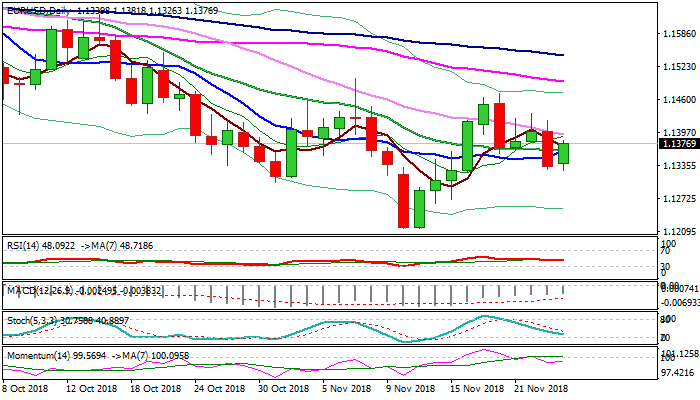 Fresh recovery attempts so far retraced over 50% of Friday’s 1.1421/1.1327 fall and unaffected by weaker than expected German Ifo data, as Business climate index fell to 102 in nov, undershooting forecast at 102.30.