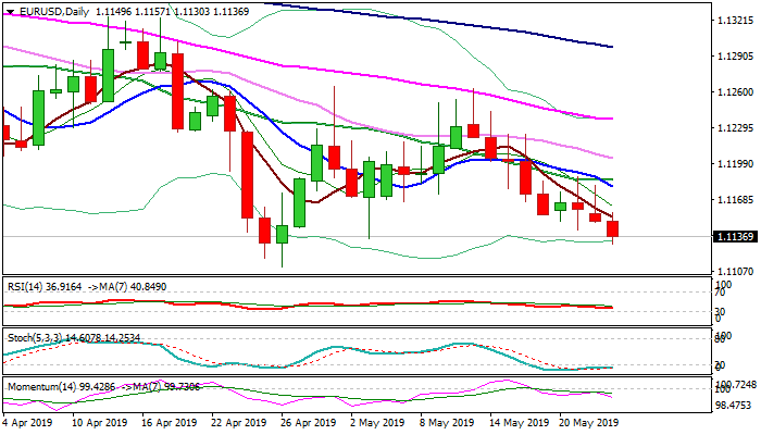The single currency is at one month low after bears took out the last obstacle at 1.1147 (Fibo 76.4% of 1.1111/1.1264) and opened way towards key support at 1.1111 (2019 low, posted on 26 Apr).