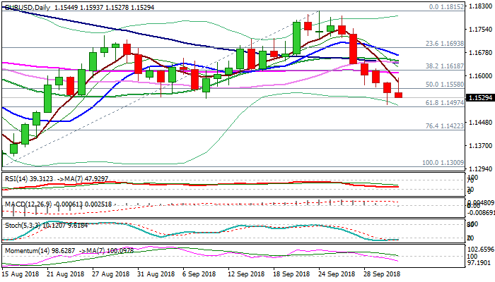 Fresh bears pressure daily cloud base, break of which would expose pivotal support at 1.1500 zone (Fibo 61.8% of 1.1300/1.1815), looking for bearish signal on close below.
