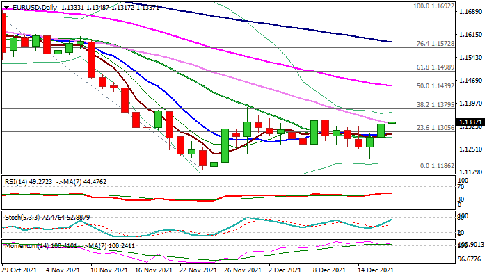 Violation of key near-term barrier at 1.1379 (Fibo 38.2% of 1.1692/1.1186) would generate positive signal for continuation of stalled recovery from 1.1186 low, while repeated close within the range would keep the pair in directionless mode.