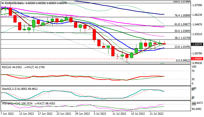 Positive signals from converging 10/20 DMA’s (rising 10DMA is likely to form a bull cross with falling 20DMA) and 14-d momentum breaking into positive territory, were so far countered with a bull-trap above 1.0270 Fibo barrier (38.2% of 1.0786/0.9952) and south-heading stochastic.