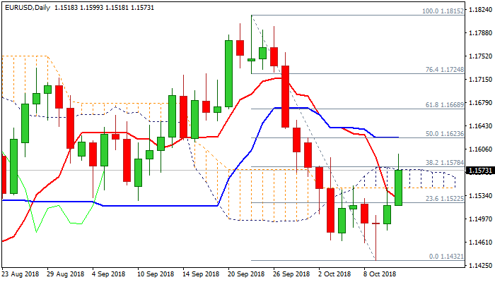 Initial positive post-data sentiment exists, however, close above key 1.1574/78 barrier is needed to sustain break above cloud and generate bullish signal for further recovery of 1.1815/1.1432 descend.