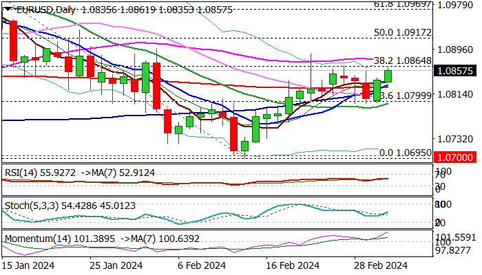 The first key requirement – close above 200DMA has been fulfilled, with focus shifting on 1.0864 Fibo level, break of which is needed to signal continuation of the bull-leg from 1.0695 (Feb 14 low).