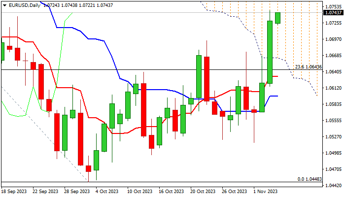 Weekly close above psychological 1.07 barrier generated initial bullish signal, as Friday’s large bullish daily candle also underpins the action for attack at next pivotal resistance at 1.0764 (Fibo 38.2% of 1.1275/1.0448), break of which to expose targets at 1.0799/1.0804 (top of thick falling daily Ichimoku cloud / converged 100/200DMA’s) and 1.0862 (Fibo 50% retracement).