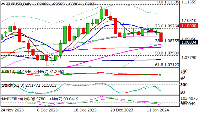 Fresh bears pressure pivotal Fibo support at 1.0875 (38.2% retracement of 1.0448/1.1139, reinforced by rising 55DMA), with firm break here to signal an end of extended consolidation, completion of a double-top (1.10) and further weaken near-term structure for extension towards next key supports at 1.0845/43 (200DMA / top of rising daily Ichimoku cloud).