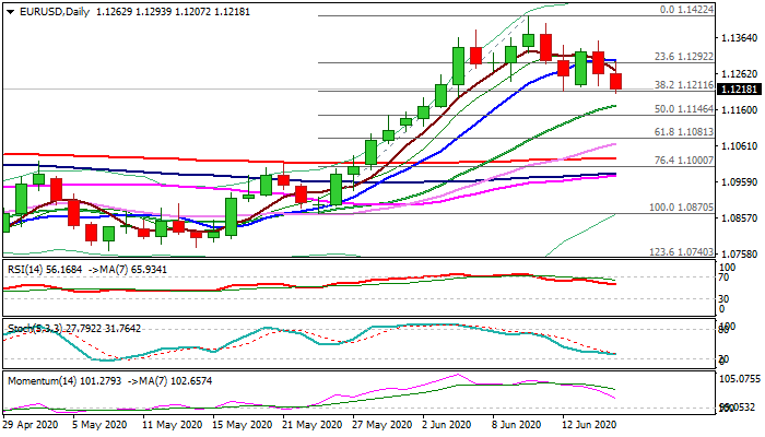 Bears look for eventual break of 1.1212 (Fibo 38.2% of 1.0870/1.1422 / 12 June low) support that would open way for deeper correction towards 1.1171 (rising 20DMA) and 1.1146 (50% retracement).