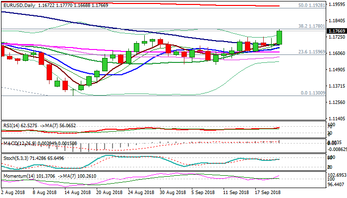 The EURUSD is on track for strong bullish daily close above broken initial pivot at 1.1733 (28 Aug former high), with break and close above 1.1780 pivot (Fibo 38.2% of 1.2555/1.1300 descend) expected to generate stronger bullish signal for acceleration towards targets at 1.1848 (14 June high) and 1.1928/45 (Fibo 50% of 1.2555/1.1300 / 200SMA) in extension.
