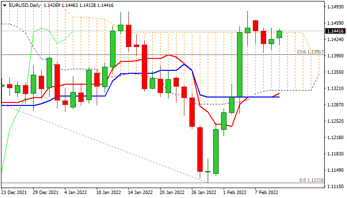 Fresh strength probes again through the top of thick daily cloud (1.1439) with close above here to generate fresh bullish signal for retest of 1.1483 peak and attack at 200WMA (1.1497), violation of which would signal continuation of recovery leg from multi-month low at 1.1121 (Jan 28 low).