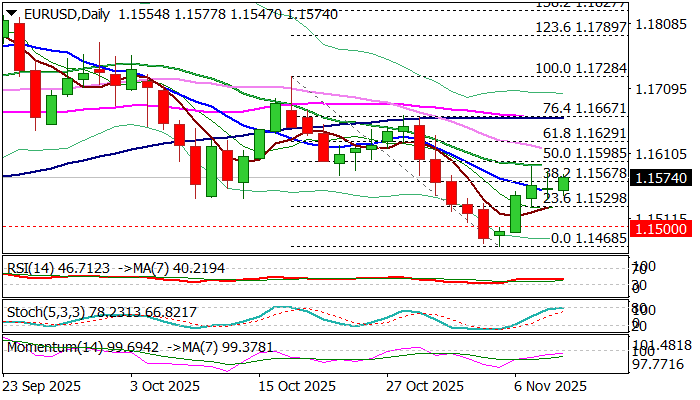The Euro remains constructive and probes again through cracked Fibo resistance at 1.1570 (38.2% of 1.1728/1.1468 descend), as recovery leg from 1.1468 was boosted by formation of bear-trap on weekly chart (under Kijun-sen).