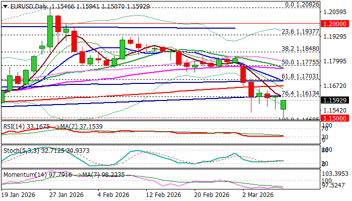 Fresh risk aversion on escalation in the Middle East further deflated the single currency, to confirm break of trendline support (1.1608), as well as break below congestion of past three days that pushed the price to new 2026 low and generated an initial signal of continuation of larger downtrend from 1.2082 (2026 peak, posted on Jan 27).