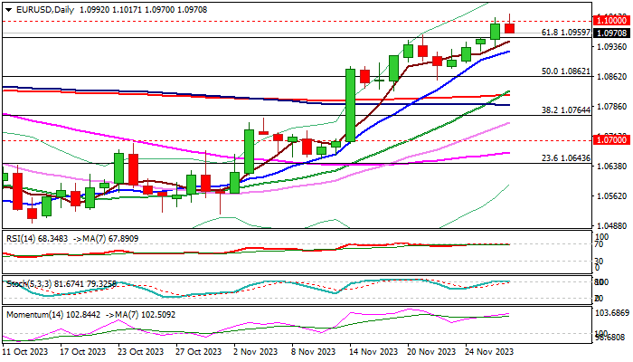 EURUSD is consolidating under new multi-week high on Wednesday, after bulls cleared pivotal Fibo resistance at 1.0959 (61.8% of 1.1275/1.0448 downtrend) and cracked psychological 1.10 barrier.