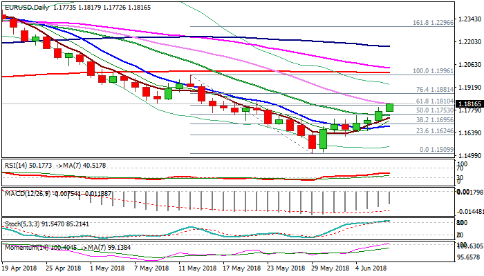 The Euro maintains bullish tone on Thursday and tests strong Fibo barrier at 1.1810 (Fibo 61.8% of 1.1996/1.1509 bear-leg, also pressuring falling 30SMA (1.1817) which reinforces resistance.