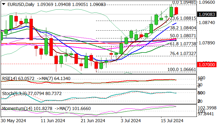 EURUSD eases further from new multi-week high (1.0948) as markets digested ECB’s decision to stay on hold and repeat its mantra that future action will be dependent on incoming economic data.