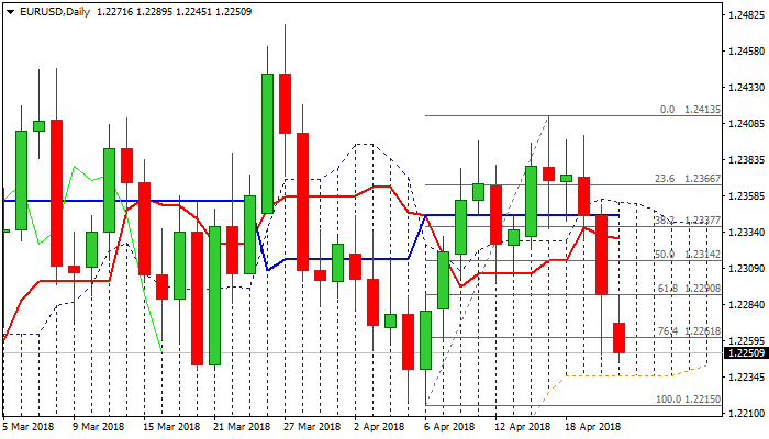 Today’s close below 1.2290 Fibo level is needed to generate further bearish signal and confirm negative sentiment, as break through 1.2215/04 would expose key short-term supports at 1.2172 (Fibo 38.2% of 1.1553/1.1.2555 rally and 1.2154 (01 Mar low of multi-month consolidation range).