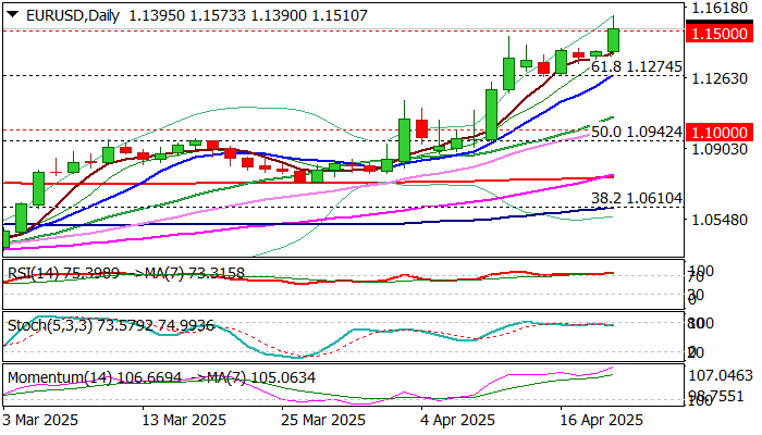 EURUSD surged through 1.15 barrier and hit new multi-year high as effect from worsening fundamentals was boosted by holiday-thinned market on Easter Monday.