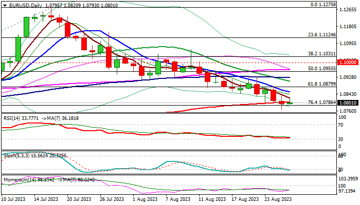 Friday’s failure to close below pivotal supports at 1.0802/1.0786 (200DMA / Fibo 76.4% of 1.0635/1.1275) and daily Doji candle, could be seen as initial signal that larger bears are running out of steam.