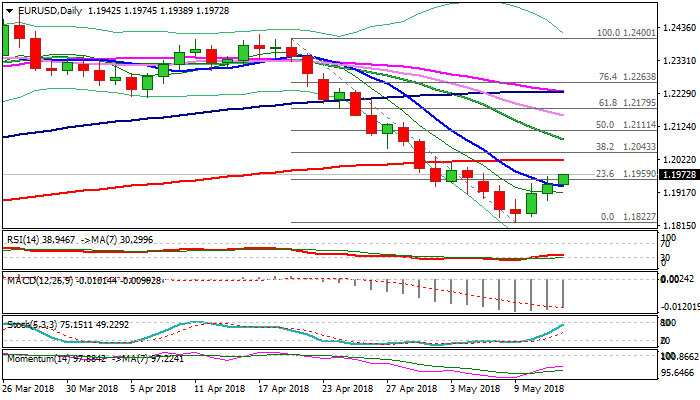 The Euro is firmly above falling 10SMA on Monday, which now acts as initial support at 1.1934 and probes into falling thick 4-hr cloud (spanned between 1.1951 and 1.2046), with sustained break of cloud base to look for test of key barriers at 1.2018 (200SMA) and 1.2046 (4-hr cloud top / Fibo 38.2% of 1.2400/1.1822 descend) break of which would generate reversal signal.
