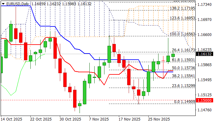 The Euro keeps firm tone on Tuesday after near-term recovery spiked to two-week high (1.1652) but subsequent quick pullback pointed to strong upside rejection (daily candle with long upper shadow).