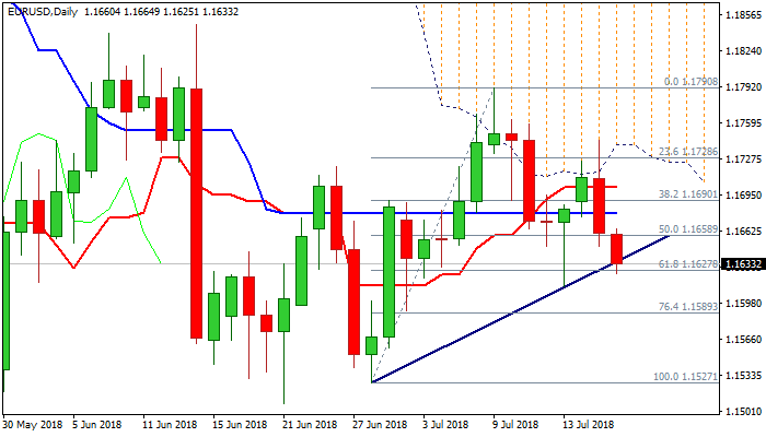 Fresh weakness cracked bull-trendline which connects lows at 1.1527 and 1.1601 (at 1.1638) and looks for attack at 1.1601 pivot, break of which is needed to complete failure swing pattern on daily chart and signal further weakness.