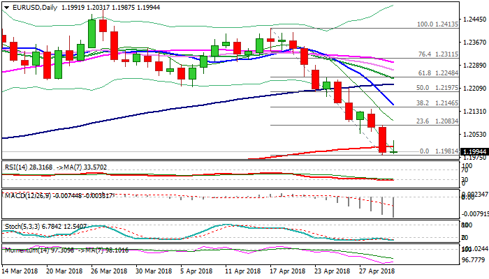 The Euro eased in early US trading on Wednesday and returned below 200SMA and 1.20 handle after better than expected US ADP private jobs data (204K in Apr vs 200K f/c) offered fresh support to the greenback, deflating Euro’s recovery attempts.