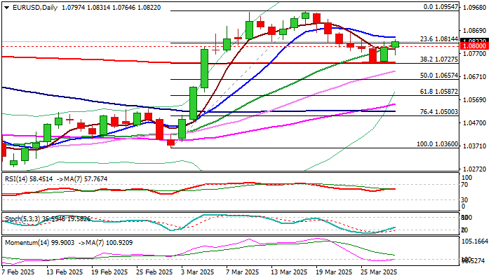 Fresh strength broke above the top of two-day congestion and generating initial basing and reversal signal after recent pullback from 1.0954 (Mar 18 top) was contained by strong support at 1.0727 (Fibo 38.2% of 1.0360/1.0954 / 200DMA).