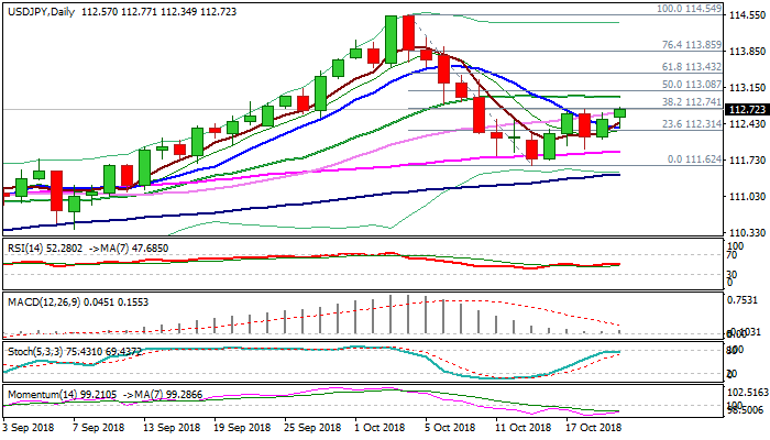 Initial support lays at 112.36 (10SMA), while return below 55SMA (111.90) would bring bears fully in play.