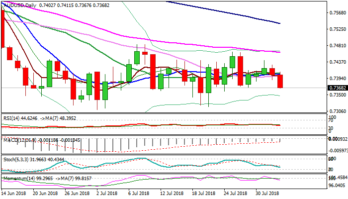 The Australian dollar holds firmly in red on Thursday and extends weakness of the previous day, denting key near-term support at 0.7370 (27 July low / Fibo 61.8% of 0.7317/0.7464 upleg).