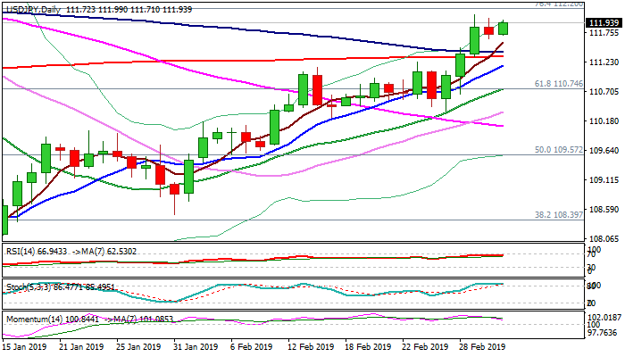 Optimism over US/China trade talks keeps the pair well supported, but traders look for more evidence, on further positive news that would inflate pair for eventual break through 112.20/31 pivots and trigger stops above.