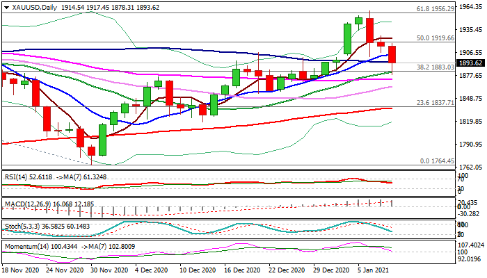 Three-day pullback found footstep at key Fibo support at $1884 (38.2% of $1764/$1959) with dip seen as positioning ahead of US non-farm payrolls data, as Democrats’ control of the US Senate fuels expectations of larger stimulus measures that would further boost metal’s appeal as an inflation hedge.