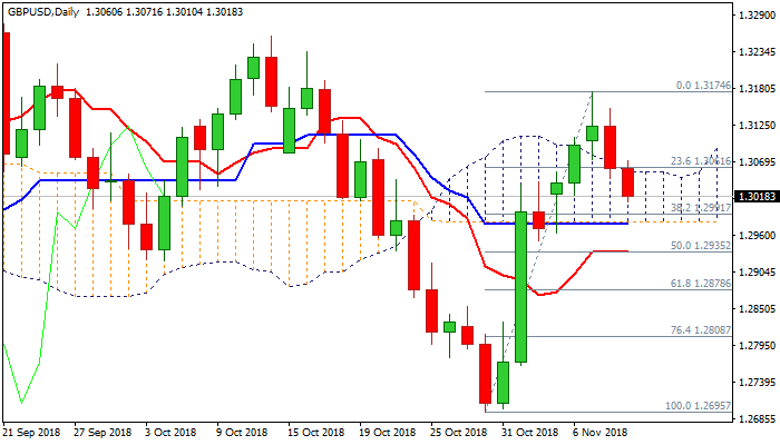 Cable extends weakness in early Friday’s trading through converging 100/55SMA’s and pressuring pivotal 1.30/1.2980 support zone (psychological support / Fibo 38.2% of 1.2857/1.3174 / daily cloud base).