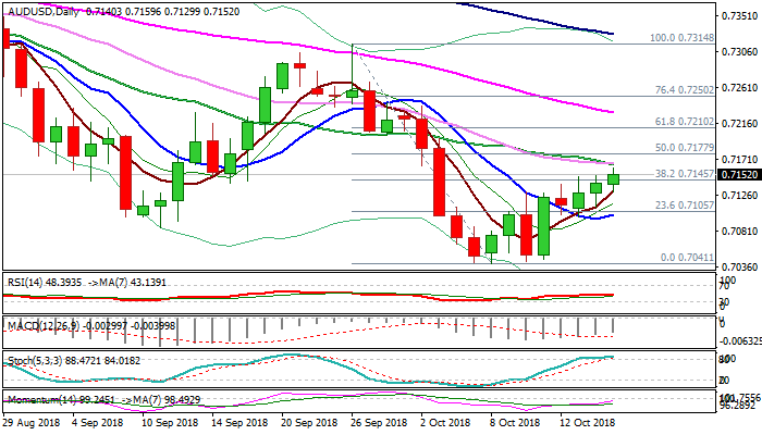 Positive tone in Asian stock markets supported Aussie’s recovery which eyes next strong barrier at 0.7165 (falling 20SMA which created bear-cross with 30SMA), break of which would provide fresh bullish signal and expose 0.7177 (Fibo 50% / daily Kijun-sen).