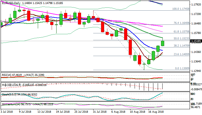 The Euro extends recovery rally into fourth straight day, supported by softer dollar and cracked very strong barriers at 1.1542/45 (falling 20SMA / weekly cloud base).