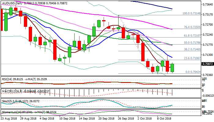 Fresh recovery is under way today, but still away from pivotal barriers at 0.7105 (Tuesday’s high) and 0.7130 (Wednesday’s spike high), break of which is needed to ease downside risk and signal recovery extension towards next key barrier at 0.7145 (Fibo 38.2% of 0.7314/0.7042 fall).