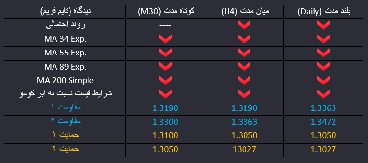 اظهارات دونالد ترامپ در جهت مخالفت با برنامه جدید برگزیت موجب کاهش تقاضا برای پوند گردید. قیمت سطح حمایتی با اهمیت 1.3190 را شکسته و در میان مدت از محدوده میانگین های میان مدت و ابر کومو در تایم فریم چهارساعته با اعتبار گذشته و احتمال اول ادامه روند نزولی قیمت در میان مدت خواهد بود. سطح حمایتی ماژور بعدی در محدوده 1.3050 است. سطح میانی چنگال اندروز میان مدت نیز می تواند مورد توجه معامله گران باشد. در بلند مدت قیمت در یک کانال نزولی در حرکت بود و حالا با پایان اصلاح میان مدت دوباره به موج نزولی بازگشته و احتمال اول ادامه روند نزولی است. سطوح حمایتی 13050 و 1.3027 محدوده ماژوری را ایجاد کرده که در صورت عبور قیمت از این محدوده احتمال نزول بلند مدت قیمت پوند افزایش می یابد. در کوتاه مدت روند نزولی شارپی بوده است و این کاهش پر زاویه ادامه دارد و احتمال ایجاد اصلاح زمانی و قیمتی در کوتاه مدت وجود دارد. سطح حمایتی 1.31 در برابر نزول بیشتر قیمت در کوتاه مدت قرار دارد.