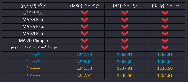 افزایش تنش های اقتصادی بر سر موضوع جنگ تجاری میان آمریکا، چین و اروپا نیز نتوانسته تقاضای طلا را در بازار افزایش دهد و قیمت همچنان در یک روند نزولی در حرکت است. امروز نیز خبر با اهمیت در تقویم اقتصادی مربوط به شاخص تورمی آمریکاست. ساعت 17 بوقت تهران شاخص تورمی قیمت مصرف کننده آمریکا اعلام میگردد که پیش بینی ها عدم تغییر نرخ رشد آن را در محدوده 0.2 درصدی نشان می دهد. در صورتیکه عدد اعلامی بیشتر از پیش بینی ها باشد می تواند تقاضا برای دلار را در بازار افزایش دهد و در نتیجه قیمت طلا کاهش می یابد. در میان مدت قیمت سطح پایین ابر کومو در تایم فریم چهارساعته را با اعتبار شکسته و احتمال نزول افزایش یافته است. سطح حمایتی ماژور 1236 دلاری در برابر نزول میان مدت و بلند مدت قیمت قرار دارد. احتمال دارد در این محدوده اصلاح کوتاه مدت یا میان مدت قیمت ایجاد شود . این قیمت پایین ترین قیمت برای طلا در یکسال اخیر است و می تواند حمایت با اهمیتی باشد. در ادامه واکنش قیمت نسبت به این محدوده تعیین کننده روند بلند مدت قیمت نیز خواهد بود. در کوتاه مدت قیمت در زیر محدوده های مهم مقاومتی و میانگین های قیمتی در رحکت است و احتمال اول نزول بیشتر قیمت خواهد بود. هرچند اخبار امروز تورمی آمریکا در روند کوتاه مدت تاثیرگذار خواهند بود.