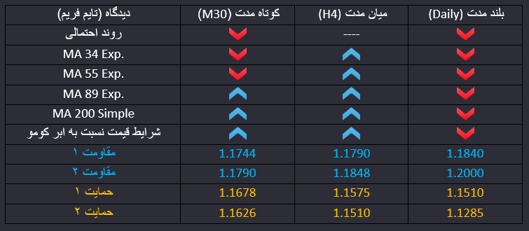 در یورو به دلار، با کاهش تقاضا برای دلار در پی صحبت های دونالد ترامپ درباره آنکه در حال حاضر دلار گران است و بالا گرفتن رقابت های ارزی آمریکا و چین، قیمت سطح بالای چنگال اندروز نزولی میان مدت و ابر کومو در تایم فریم چهارساعته را شکسته و در میان مدت احتمال ایجاد روند صعودی افزایش یافته است. در حال حاضر و در میان مدت قیمت در شرایط اصلاح و پولبک نسبت به سطوح شکسته شده در حرکت است و احتمال اول ادامه روند صعودی با پایان اصلاح خواهد بود. در بلند مدت اما قیمت همچنان در بالای حمایت 1.1510 رنج است و در حال حاضر به سطح اصلاح فیبوناچی 23.6 درصدی و میانگین 55 روزه خود رسیده و نسبت به آن واکنش برگشتی داشته است. در بلند مدت احتمال اول همچنان ادامه روند نزولی با پایان حرکت اصلاحی و رنج خواهد بود و در اینصورت واکنش قیمت نسبت به سطح 1.1510 با اهمیت خواهد بود. در کوتاه مدت قیمت به سطح ماژور 1.1744 رسیده و نسبت به آن واکنش برگشتی داشته است، که احتمال اول ادامه نزول تا محدوده 1.1678 خواهد بود.