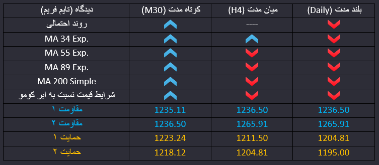 در طلا، در آستانه دیدار ترامپ و یونکر رییس کمیسیون اروپا و در ادامه گمانه زنی ها درباره جنگ تجاری بین المللی، قیمت در میان مدت در حال اصلاح و پولبک به سمت حمایت شکسته شده و تغییر قطب یافته 1236 دلاری است و در همین محدوده ابر کومو و میانگین های میان مدت نیز در برابر صعود بیشتر قیمت مقاومت دارند و احتمال اول برگشت قیمت از محدوده مقاومتی 1236 دلاری خواهد بود. در بلند مدت نیز این یک حرکت اصلاحی و پولبک میان مدت محسوب میشود و احتمال اول نزول قیمت با پایان اصلاح است. در کوتاه مدت اما قیمت سطوح مقاومتی کوتاه مدت در تایم فریم سی دقیقه و یکساعته را شکسته و احتمال اول در کوتاه مدت ادامه صعود تا محدوده 1235 و 1236 دلاری خواهد بود.