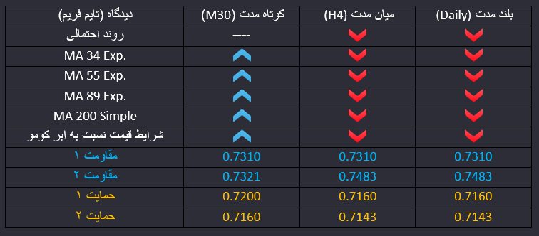 دلار استرالیا به دلار آمریکا، بامداد امروز تغییرات اشتغال و نرخ بیکاری استرالیا اعلام شد، که با وجود کاهش فرصت های شغلی در ماه گذشته، نرخ بیکاری استرالیا کاهش داشت و موجب افزایش کوتاه مدت تقاضا برای دلار استرالیا گردید. این افزایش تقاضا موجب پولبک قیمت به حمایت شکسته شده 0.7310 شد. اما همچنان معامله گران از افزایش نرخ بهره رزرو بانک نا امید هستند و احتمال اول در میان مدت ادامه روند نزولی قیمت با پایان اصلاح و پولبک خواهد بود. در بلند مدت قیمت به پایین ترین سطح در بیش از یکسال و نیم اخیر رسیده و احتمال نزول بیشتر قیمت وجود دارد . سطح حمایتی ماژور 0.7140 پایین ترین برابری قیمت در بیش از دو سال و 5 ماه اخیر است و واکنش قیمت نسبت به این سطح در بلند مدت تعیین کننده است. در کوتاه مدت قیمت روندی صعودی دارد و به سطح مقاومتی 200 در تایم فریم 30 دقیقه رسیده است و احتمال پایان اصلاح و صعود در این محدوده وجود دارد.