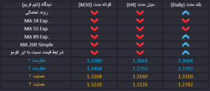 با وجود آنکه آمار اشتغال آمریکا باز هم افزایشی بود اما آمار اشتغال و بیکاری کانادا هم بهتر از انتظار ها بود و قیمت نفت نیز در بازار رو به افزایش است و این موضوع تقاضا برای دلار کانادا را افزایش داده و قیمت سطوح حمایتی را یکی پس از دیگری شکسته و احتمال اول در میان مدت ادامه روند نزولی خواهد بود. سطوح حمایتی 1.3160 و 1.3126 در برابر نزول بیشتر قیمت قرار دارند. نزول روزهای اخیر قیمت شارپی بوده است و احتمال اصلاح قیمتی و زمانی کوتاه مدت نیز وجود دارد.