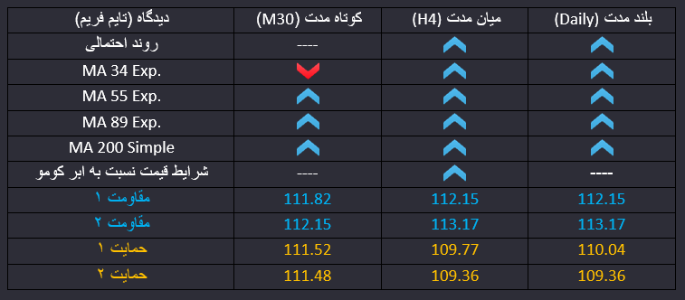 دلار به ین، با اعلام آمار بهتر از انتظار از رشد اقتصادی آمریکا، تقاضا برای دلار در برابر ین افرزایش یافته و قیمت سطح مقاومتی 111.43 را شکسته و احتمال اول