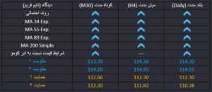 دلار به ین، قیمت پس از یک اصلاح نزولی میان مدت ، به موج صعودی بازگشته و با عبور از مقاومت های مهم میان مدت ، در حال حاضر به محدوده مقاومتی سطح بالای ابر کومو در تایم فریم چهارساعته رسیده است. عبور معتبر قیمت از این محدوده احتمال صعود قیمت در میان مدت را افزایش می دهد. در بلند مدت قیمت در واکنش به سطح بالای ابر کومو روزانه به موج صعودی بازگشته و احتمال اول ادامه روند صعودی خواهد بود.